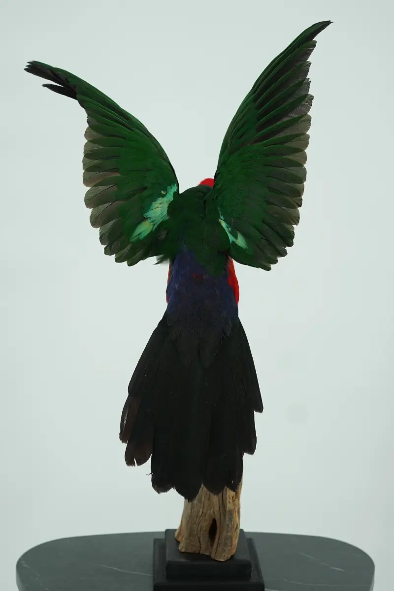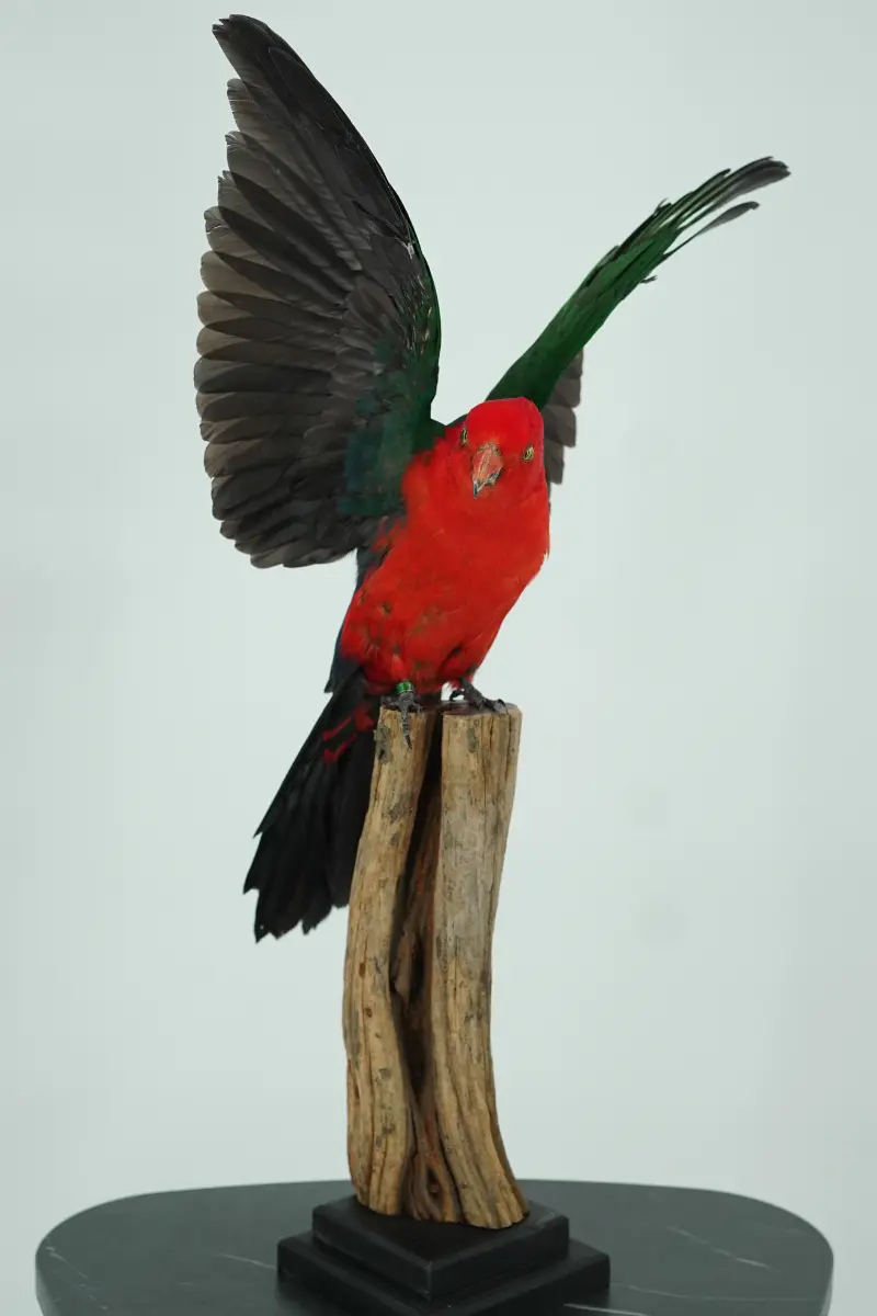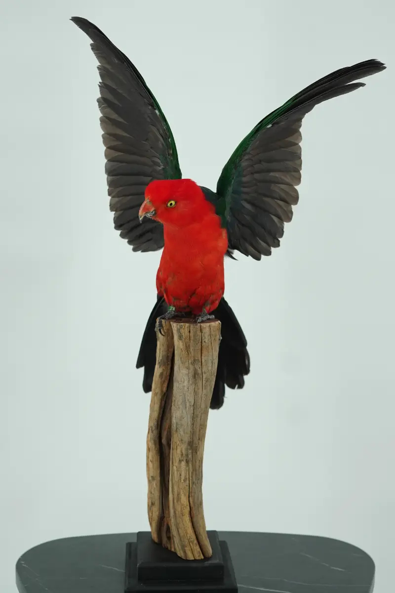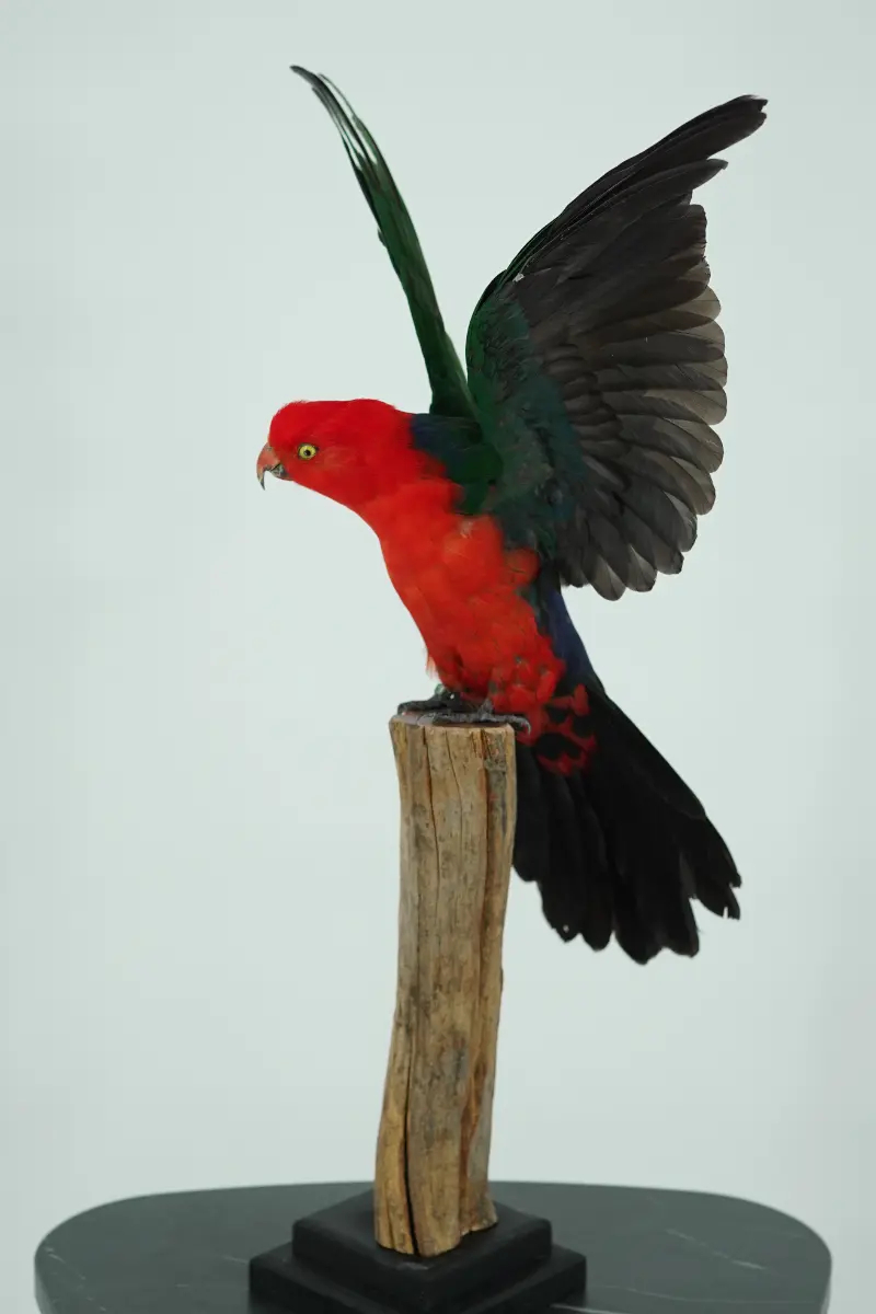 Deze prachtig opgezette koningsparkiet is een meesterwerk van taxidermie. Het dier is met uiterste zorg en vakmanschap geprepareerd, waarbij de natuurlijke uitstraling en kleuren volledig behouden zijn gebleven. Dit bijzondere decoratiestuk brengt direct een unieke sfeer in huis, kantoor of winkel.